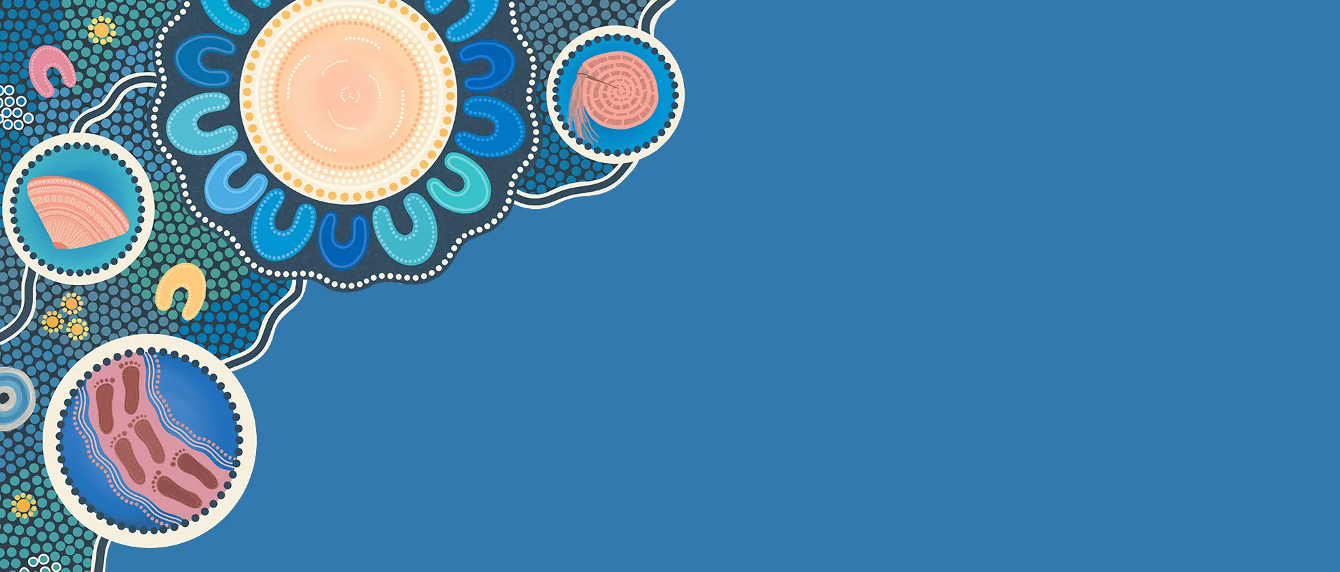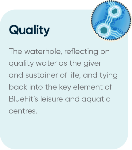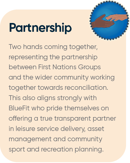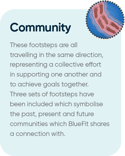 This artwork design centres around the community of BlueFit, and the range of programs that cater to the diverse communities they service. The artwork tells a story of reconciliation through respect, partnerships, connection to Country and community.