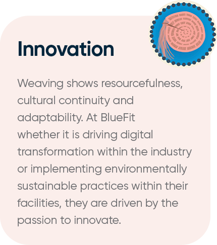 The background has symbols of people and meeting places to represent all the various locations and communities of Bluefit. I have also included symbols of waterholes and wattle to represent connection to Country as well as sustainability as a contributor to reconciliation.